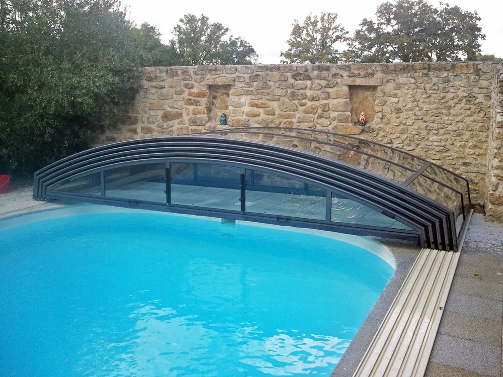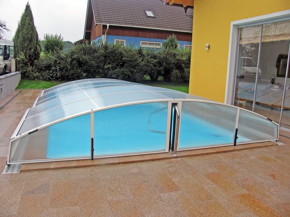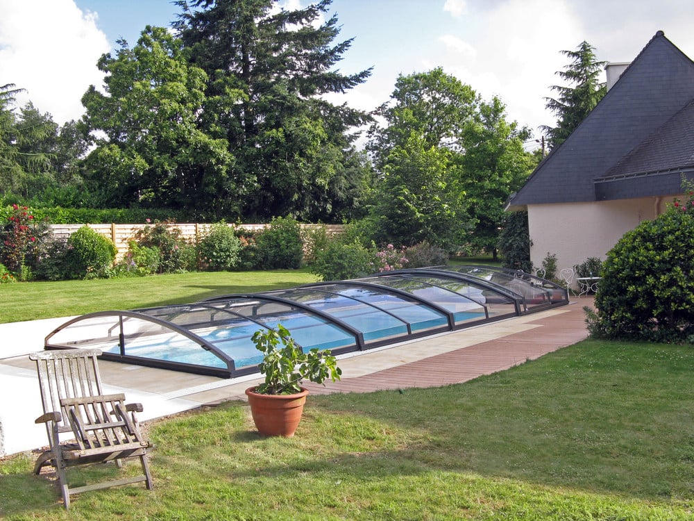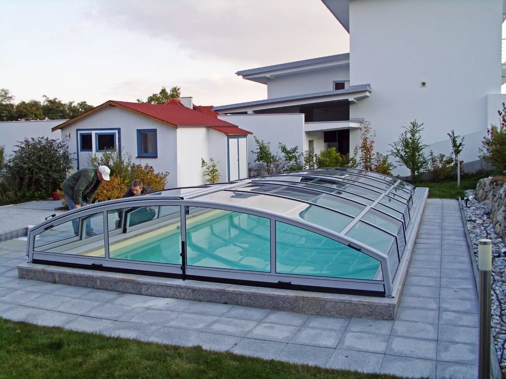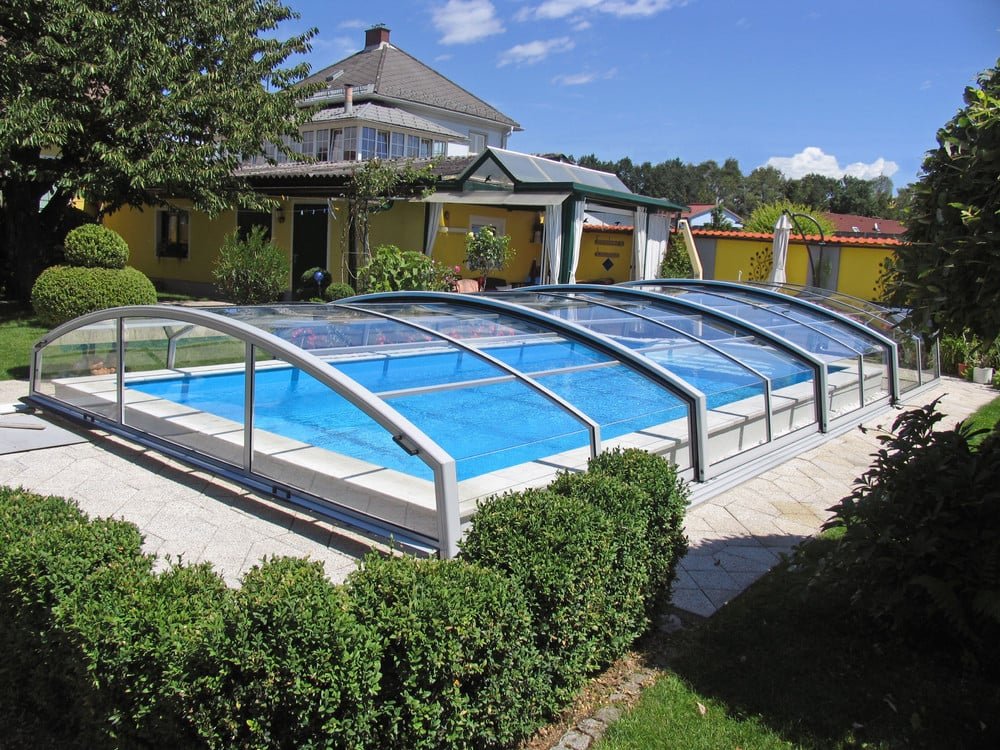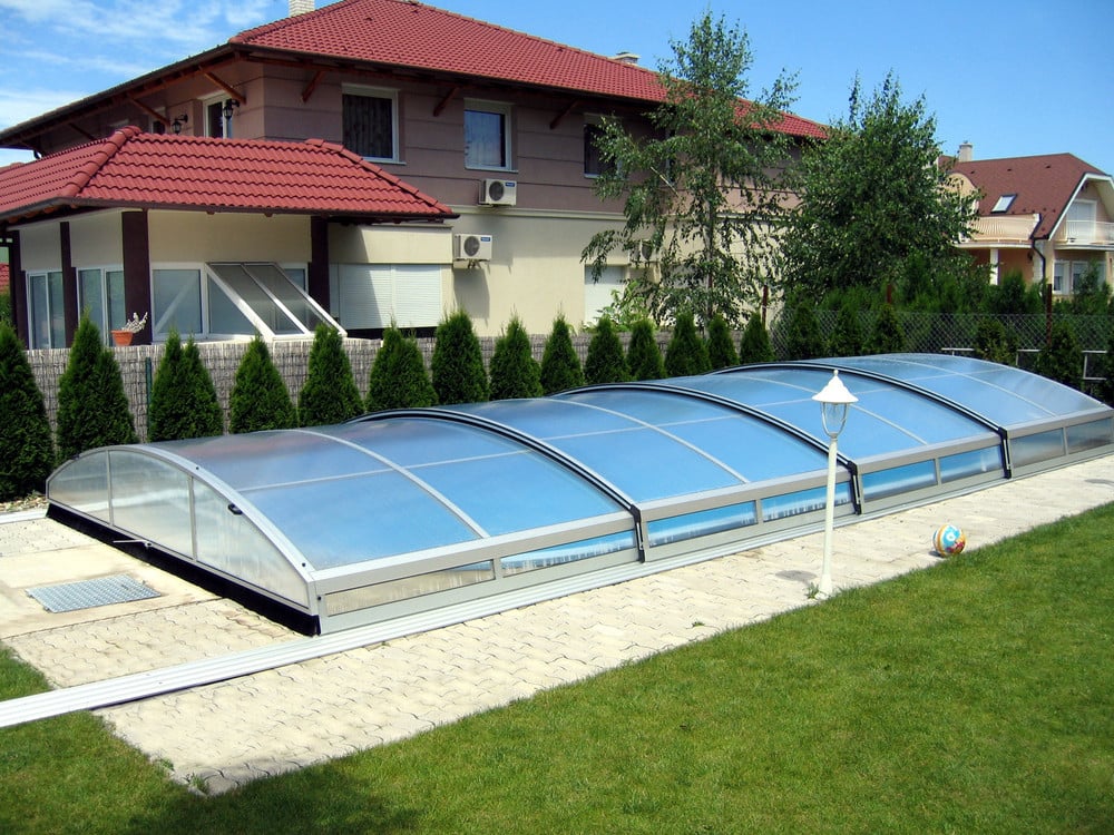 Another low swimming pool enclosure which protect you against bad weather and allows you to use you pool in cooler months. Imperia model offers a very modern shape with a sharp edge. This enclosure will look beautiful in any garden.