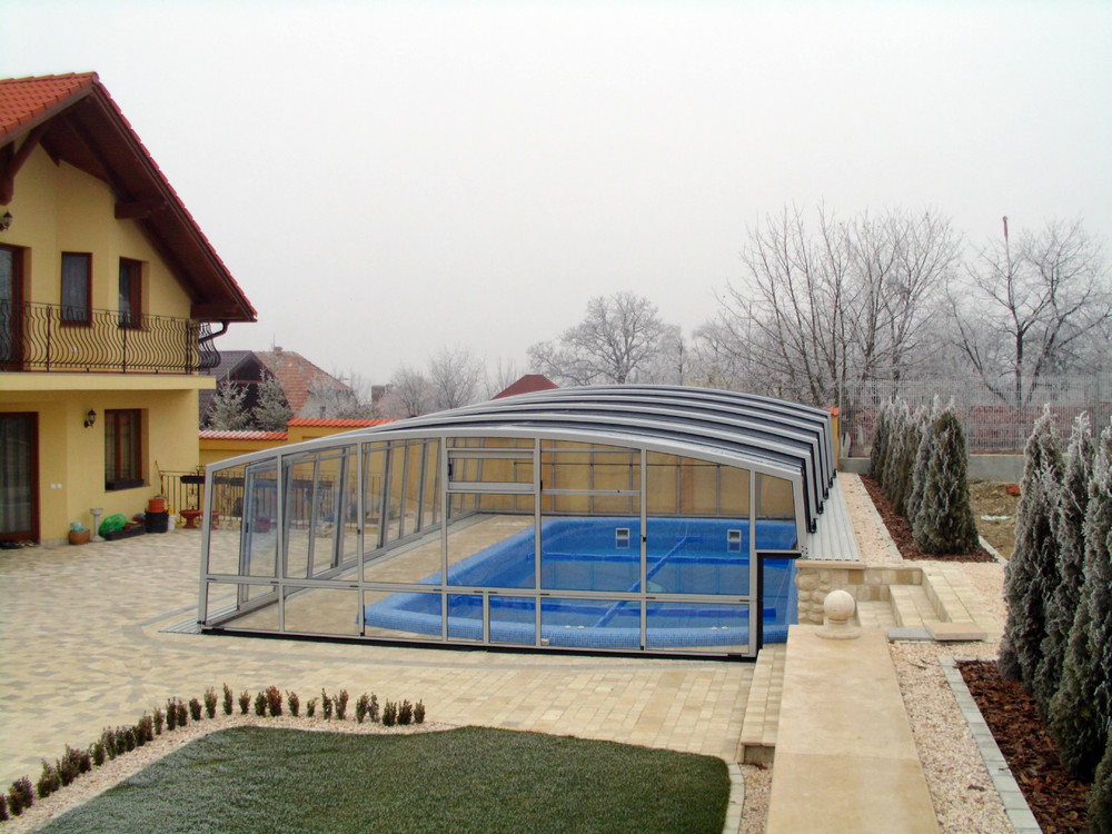 Venezia enclosure has the highest load capacity and strength from all models. This enclosure is very popular for spaciousness and thanks to the vertical walls its ability for customers to walk all around the swimming pool.